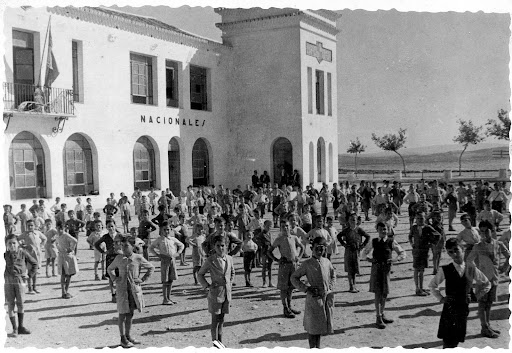 “Era costumbre entonces antes de entrar a la escuela, formar cada día en el patio del colegio, bien alineados como pequeños soldados que comenzaban su jornada educacional cantando el himno nacional y otras marchas y cánticos del régimen. Uno de los niños, era quien cada mañana desde el balcón central, mientras izaba la bandera hacía la introducción entonando las primeras notas de dicho himno patrio con un… ¡Viiiiiva Espaaaaaña! Y después, seguíamos todos a la vez cantando al mismo son… ¡alzad los brazos hijos del pueblo español, que empieza a resurgir…! Etc.etc.