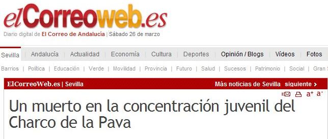 Queridos amigos del Blog, hoy os traemos la terrible noticia que hemos conocido esta mañana. Un chico de 24 años nacido en Ibiza pero vecino de La Puebla de Cazalla, de donde era originaria su familia, ha fallecido en Sevilla víctima de un apuñalamiento cuando asistía a la fiesta de la primavera en el Charco de la Pava. Desde aquí mandamos un fuerte abrazo de pésame a toda su familia y hacemos una petición a las autoridades para que esta clase de actos tengan una mayor vigilancia policial para impedir sucesos de este tipo.