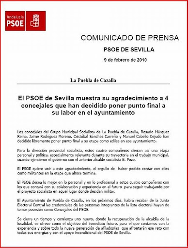 COMUNICADO DE PRENSA DEL PSOE DE SEVILLA. DIMISIÓN DE CONCEJALES SOCIALISTAS EN LA PUEBLA DE CAZALLA