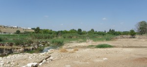 El que registra la fotografía de arriba es el punto que Hernando Colón, o sus agentes, describen al escribir: “pasan el río dicho de caçalla por vado que corre a la mano derecha” pues estimados amigos, si observáis en la mencionada fotografía, justo en su lado derecho se ven los pilotes del puente de hierro inacabado que está actualmente en el parque, puente que cuando se empezó a construir dio lugar a que apareciesen los cimientos de otro puente más antiguo, que es lógico pensar que estaba erigido en el mismo o aproximado lugar donde el lecho del río ofrecía menos dificultades, o sea en un vado. Por otra parte, a este lugar es a donde viene a dar la llamada colada de Morón a Osuna que con toda probabilidad es el camino que se siguió en la Descripción.