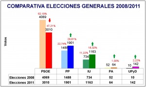 ¿A qué partidos han ido los 1.059 votos que ha perdido el PSOE? Si sumamos la diferencia de votos nulos y blancos, ésta es 53 más que en 2.008. El PP ha obtenido 413 votos más, IU, 434 votos más; UP y D, 132 votos más, lo que todo ello hace una suma de 1032, a los que podemos añadirles los 20 votos conseguidos por la fuerza ecologista EQUO, lo que daría 1.052, por lo que los votos perdidos por el PSOE, engordarian a todos los demás en una proporción aproximada a lo que hemos visto.