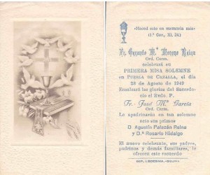 Estampa recordatorio de la primera misa solemne oficiada por el padre Gerardo en 1.949. Obsérvese que el nombre de pila que figura en la msima es Gerardo María y no José Gerardo. Procedencia archivo Curro Marín