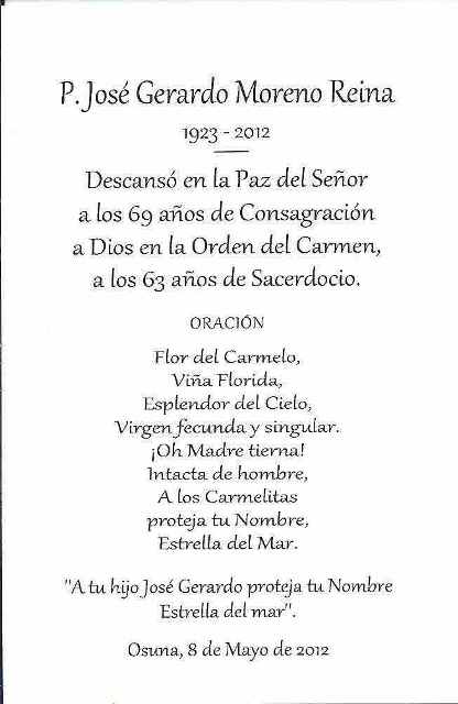 “Ayer por la mañana falleció en Osuna, donde era muy querido y respetado, fray José Gerardo Moreno Reina O.C. Nacido en Puebla de Cazalla el 28 de noviembre de 1.923, a muy temprana edad sus padres se trasladaron a Osuna, donde se establecieron en una casita de la calle Aguilar. Ingresó en el seminario carmelita de Hinojosa del Duque cuando cumplió 11 años. Allí continuó sus estudios primarios y el bachillerato. Tras el estallido de la guerra civil fue acogido por la familia de don Pablo Agudo como un hijo más, hasta que fue reclamado por sus padres y pasó a la Zona Nacional.