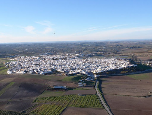 En La Puebla desde el este o al este de La Puebla, si aumentamos la imagen veremos que alguien vuela en parapente por el este, rumbo al Perotonar, La Puebla se redondea por el sur, al fondo de la imagen las primeras estribaciones de la Sierra Norte de Sevilla con la campiña entremedias. En el este el edificio de la parroquia confundido con las naves de junto al Arquillo Viejo.